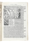 In folio (mm 310x210). Carte [10], CIIII. Frontespizio entro ricca cornice xilografica, vignette e grandi iniziali xilografiche nel testo. Foro causato da bruciatura alla carta K (con perdita di testo), strappetto al margine della carta XXXV, carte occasionalmente brunite in modo pallido, qualche lieve gora marginale e macchiolina, qualche trascurabile forellino di tarlo che tocca il testo in qualche punto, restauro all'angolo della sguardia anteriore. Legatura posteriore realizzata con frammenti di pergamena su cartone, bindelle assenti, titolo manoscritto al taglio inferiore. La legatura ha un capolettera miniato proveniente da codice liturgico della fine del XIII-inizio XIV secolo. L'inchiostro, ormai sbiadito, riportava il testo in latino (si intravede una scrittura gotica e anche una mano più recente che ha trascritto alcune parole non afferenti al testo originale della pergamena) accompagnato dai neumi (notazione musicale diastematica; è ancora parzialmente visibile la linea rossa del Fa). L'iniziale miniata, discretamente conservata, è entro lineare geometrico a forma di trapezio; ritrae due cani o lupi sulle zampe posteriori, le cui code si incrociano. Le figure sono state realizzate con i colori dell'arancione, giallo, verde e avorio su campo azzurro. Iniziale capitale A. Dimensioni della miniatura: 73x49 mm. (1) Raffinata opera che rispecchia un momento cruciale della stampa umanistica veneziana, dove testo, commento e immagine cooperano per una lettura colta e stratificata. Il volume si apre con un frontespizio architettonico incorniciato, riccamente ornato da elementi classici e putti, in cui è inserito il titolo in elegante carattere romano. L'edizione comprende i commenti di Giovanni Britannico, Giovanni Battista Plautio e Bartolomeo Fonte, e si inserisce in un più ampio sforzo umanistico di recupero morale e linguistico dei testi antichi. Le sei xilografie che introducono ciascuna satira non sono solo decorative, ma svolgono anche una funzione esplicativa e allegorica, accompagnando il lettore nel riconoscimento visivo dei temi morali e sociali trattati. Adams P 736; Essling 798; Sander 5569.