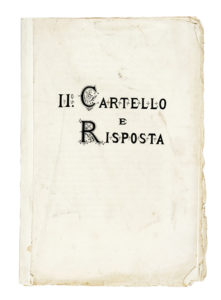 In-4° (mm 245x167). Pagine: [2], 11, [1]. Frontespizio con titolo "II° Cartello e Risposta". Carte sciolte e un po' gualcite. Senza legatura e con minimi segni del tempo, in barbe. (1) Rarissimo facsimile di una pregiata e rara edizione stampata a Milano da Francesco Marchesino a metà Cinquecento. Il facsimile fu stampato a cura di Enrico Giordani, curatore de I sei cartelli di matematica disfida primamente intorno alla generale risoluzione delle equazioni cubiche di Lodovico Ferrari, coi sei contro-cartelli in risposta di Nicolo Tartaglia [...] proposti raccolti, autografati e pubblicati da Enrico Giordani; premesse notizie bibliografiche ed illustrazioni sui cartelli medesimi, estratte da documenti già a stampa ed altri manoscritti favoriti dal comm. prof. Silvestro Gherardi. (Milano: R. Stabilimento litografico di Luigi Ronchi e tipografia degl'ingegneri, 1876, e anche Roma: Tipografia delle scienze matematiche e fisiche, 1878). Di questo insieme, SBN registra parti sciolte come la presente. Su Giordani si veda: Masotti Arnaldo, Sopra Enrico Giordani: notizie raccolte in occasione dell'offerta all'Istituto lombardo di una sua lettera e di un esemplare della sua edizione dei Cartelli di sfida matematica di Lodovico Ferrari e Niccolò Tartaglia. Parole di accompagnamento del m. e. Arnaldo Masotti, Milano: Istituto lombardo di scienze e lettere, 1979. L'opera è legata a uno degli episodi più noti della storia della matematica rinascimentale: la controversia sulla priorità nella risoluzione delle equazioni di terzo grado. Ludovico Ferrari (Bologna, 1522-1565), brillante discepolo e diretto erede intellettuale di Girolamo Cardano, fu tra i principali protagonisti di questa disputa, che coinvolse anche Niccolò Tartaglia e Scipione dal Ferro. La presente pubblicazione corrisponde al secondo dei sei celebri "cartelli di matematica" con cui Ferrari sfidò pubblicamente Tartaglia, difendendo l'onore e il contributo scientifico del suo maestro. Una testimonianza polemica e storica di grande importanza, che getta luce su un momento cruciale del pensiero algebrico moderno. Per l'edizione originale: EDIT16 CNCE 40960; E. Sandal, L'arte della stampa a Milano nell'età di Carlo V, p. 98.