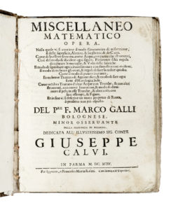 Galli Marco, Miscellaneo matematico opera. Nella quale si contiene il modo geometrico di misuratione... In Parma: Per Ippolito e Francesco Maria Rosati, 1694.