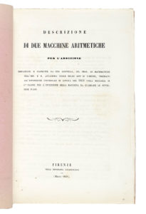 In-4° (mm 258x175). Pagine: 35, [1]. Con 2 ampie tavole litografiche più volte ripiegate in fine, su disegni di Giuseppe Paoletti (minimi strappetti all'attaccatura di entrambe). Qualche minima traccia del tempo ma buona copia genuina nella sua brossura editoriale rosa (difetti al dorso, che ha una mancanza alla testa ed è stato restaurato). (1) Rara prima edizione di questa importante opera dedicata a due prototipi di calcolatrice. Tito Gonnella (1794-1867) presentò la sua prima macchina calcolatrice alla Grande Esposizione di Londra del 1851, dove vinse la prima medaglia. Le sue ricerche furono finanziate da Leopoldo II, Granduca di Toscana, al quale donò una delle tre macchine calcolatrici costruite nel 1857. Esempi di entrambe le macchine sopravvivono ancora oggi, la prima a all'Arithmeum di Bonn, la seconda al Museo di Storia della Scienza di Firenze.