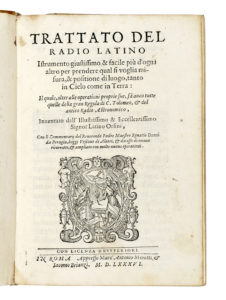 Orsini Latino, Trattato del radio latino instrumento giustissimo & facile più d'ogni altro per prendere qual si voglia misura, & positione di luogo, tanto in cielo come in terra... In Roma: appresso Marc'Antonio Moretti & Iacomo Brianzi, 1586.