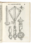 In-8° (mm 170x120). Pagine [16], 112. Marca editoriale xilografica con l'Annunciazione in cornice al frontespizio, testo in corsivo e romano, a pagina 55 e 59 nuove figure xilografiche sono state incollate dal tipografo su quelle originali. Occasionali fioriture sbiadite, minimo lavorino di tarlo all'angolo inferiore interno del fascicolo A, piccolo alone sbiadito all'angolo interno inferiore, strappetto al margine esterno di C2 che tocca il testo. Piena pergamena con titoli manoscritti al dorso (difettini). (1) Seconda edizione, molto rara, pubblicata dopo la princeps del 1583, in cui il celebre matematico e astronomo perugino Egnazio Danti descrive e illustra l'uso del Radio Latino, strumento ideato da Latino Orsini. Composto da un'asta centrale e quattro aste snodate a parallelogramma con visori, lo strumento integra scale graduate (gradi, quadrato delle ombre, braccia, rosa dei venti, angoli di poligoni regolari, diametri di palle d'artiglieria) e una bussola nel manico. Richiudibile a forma di pugnale, era impiegato in astronomia, navigazione e artiglieria, per misurare altezze celesti o calcolare gittate.