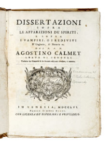 Calmet Augustin, Dissertazioni sopra le apparizioni de spiriti e sopra i vampiri, o redivivi d’Ungheria, di Moravia ec... In Venezia: presso Simone Occhi, 1756.