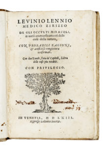 In-8° (mm 153x103). Carte [16], 156. Marca tipografica al frontespizio. Note di possesso anticamente manoscritte e forellini di tarlo al frontespizio, occasionali macchiette, fioriture e gorette marginali sbiadite, restaurino al margine interno di C8. Cartonato d'attesa con sguardie rinnovate e tasselli di biblioteche private al dorso. (1) Edizione in volgare rara sul mercato di questo popolare trattato di Levinus Lemnius (1505–1568), medico e scienziato olandese, allievo di Vesalio a Pavia. Pubblicata per la prima volta in latino nel 1559 col titolo Occulta Naturae Miracula, l'opera fonde sapere scientifico ed esoterismo. Rispetto ad altri testi simili del Cinquecento, più sensazionalistici, questo lavoro si distingue per profondità e rigore. Tra i molti temi trattati: ereditarietà, ginecologia, immortalità dell'anima, sonnambulismo, epilessia, astrologia, proprietà delle erbe e del vino, natura dei sogni, usi igienici di cibi e bevande, e curiosità come l'origine degli ermafroditi o l'eccellenza del quarto dito. Per i numerosi riferimenti alla salute e all'alimentazione, Lemnius è considerato uno dei primi igienisti del Cinquecento.