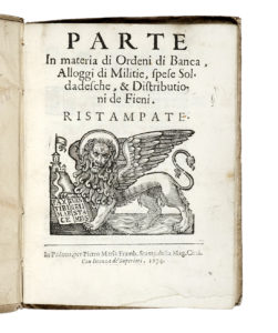 Parte in materia di Ordeni di Banca Alloggi di Militie, spese soldadesche, & distribuitioni de Fieni. Ristampate. In Padova: per Pietro Maria Framb. Stamp. della Mag. Città, 1674.