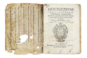 In-4° (mm 202x148). Pagine: [4], 91, [1]. Stemma Piccolomini al frontespizio. Pallide fioriture e macchiette occasionali. Legatura in pergamena - con alcuni difetti - proveniente da codice liturgico. Si tratta di un antifonario della fine del XI-inizio XII secolo e con testo afferente anche alla festa di San Fabiano e San Sebastiano (Sebastianus dixit ad Nicostratum salvator noster pro peccatoribus dignatus est suam exhibere praesentiam [...]). Testo latino in scrittura carolina a inchiostro bruno, iniziali e rubrica in rosso. Notazione musicale diastematica a inchiostro bruno su un unico rigo (quello del Fa segnato in rosso). Neumi perfettamente leggibili. Molto rari sul mercato fogli in notazione diastematica. Questo manoscritto è un prezioso testimone dell'antica scrittura musicale del canto romano. (1) Pubblicazione di storia senese rara sul mercato. Ascanio I Piccolomini (1548-1597) è stato un arcivescovo cattolico e scrittore italiano. Nominato V arcivescovo di Siena, si adoperò a rinnovare la città secondo le nuove disposizioni stabilite dal Concilio di Trento, e a ristrutturarne gli edifici di culto.