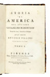 In-folio (mm 320x210). Pagine: [8], 802, [2], xxxv, [21]. Frontespizio con marca editoriale e nota manoscritta di ex-libris, alla sguardia anteriore nota moderna manoscritta con inchiostro rosso, al verso del frontespizio stemma della città di Genova con data dell'edizione manoscritta in inchiostro rosso, iniziali e fregi xilografici. Lavorini di tarlo lungo il margine interno e inferiore senza perdite di testo, leggere bruniture e arrossature sparse, macchioline e fioriture, il primo fascicolo leggermente stanco e altri minimi segni del tempo. Legatura posteriore in piena pelle, piatti decorati con medaglione dorato in centro entro filetto dorato e decori floreali agli angoli, dorso con mancanze nella parte inferiore e superiore, piatto anteriore parzialmente staccato, qualche abrasione e sbucciatura. [SI AGGIUNGE:] Robertson William, Storia di America... Firenze: nella stamperia Allegrini, Pisoni e Comp. e si trova vendibile presso Giuseppe Molini librajo degli Archibusieri, 1777-1778. 4 volumi in-12° (mm 165x104), non collazionati ma scompleti delle tavole. Mezzo vitellino coevo con titoli dorati ai dorsi, piatti marmorizzati (abrasioni alle estremità). (5) OPERA I: Prima edizione di quest'opera sulla Repubblica di Genova dal 1100 al 1578, con descrizione delle guerre contro i Saraceni, le rivalità con Pisa e Venezia e gli scambi commerciali con l'Oriente. Alle pp. 371-376 inizia una relazione su Colombo e i viaggi nel nuovo mondo. Adams B2 089. Alden 579/4. Bell B235. BM STC Dutch p. 35. Graesse I 433. JCB I p 274. Sabin 5663. Voet 726.