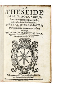 Boccaccio Giovanni, La Theseide [...] Innamoramento piaceuole, & honesto di due giouani thebani. In Lucca, appresso Vincenzo Busdraghi ad istantia di Giulio Guidoboni, 1579.
