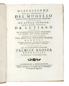 Brocchi Giuseppe Maria, Descrizione della provincia del Mugello con la carta geografica del medesimo... In Firenze: nella stamperia d'Anton Maria Albizzini, 1748.
