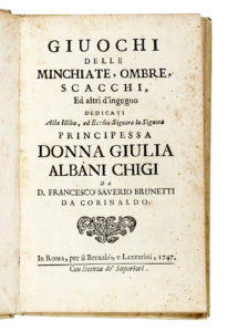Brunetti Francesco Saverio, Giuochi delle minchiate, ombre, scacchi, ed altri d’ingegno... In Roma: Bernabò e Lazzarini, 1747.