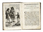In-4° (mm 174x121). Pagine: [4], 152. [1] carta di tavola, collazionato completo. Con l'aggiunta di una carta di tavola ripiegata incollata tra le carte C3-C4 rappresentante la visita del capitano Byron in Patagonia (un po' brunita e rifilata). Frontespizio con piccolo restauro marginale esterno, timbro evanescente in fine, qualche leggera fioritura sparsa ma complessivamente una buona copia. Pieno cartonato contemporaneo con titoli manoscritti al dorso entro pecetta. (1) Unica edizione italiana attestata del resoconto del viaggio compiuto attorno al mondo dalla nave inglese "The Dolphin", comandata da John Byron, a partire dal 1764, con l'intento di raccogliere informazioni sulle terre dei mari del sud e, soprattutto, sugli abitanti della Patagonia. L'edizione originale inglese apparve anonimamente l'anno precedente, ma il testo è tradizionalmente attribuito a Charles Clerke, uno dei principali ufficiali della spedizione, imbarcatosi in seguito in tutti e tre i viaggi attorno al mondo di Cook. Sabin 9732.