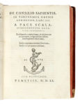 3 opere rilegate insieme in-4° (mm 200x140). Marca editoriale al frontespizio e in fine, fregi e iniziali xilografiche. Ottimo stato di conservazione se non per trascurabili segni del tempo, ex-libris al contropiatto anteriore. Piena pelle posteriore con titoli e fregi in oro al dorso entro tassello in marocchino, mancanza al piede del dorso e qualche leggera sbucciatura, tagli spruzzati di rosso e sguardie marmorizzate. [RILEGATO CON:] Scala Pace, De consilio sapientis... Venetiis: [Paolo Manuzio], 1560. Qualche annotazione di antica mano alle prime carte. [RILEGATO CON:] Follerio Pietro, Praxis censualis, super pragma. De censibus... Venetiis: impensis Marci de Maria, Salernitani, bibliopolae Neapolitani, 1559. (1)