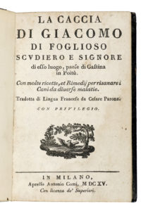 Du Fouilloux Jacques, La caccia di Giacomo di Foglioso... In Milano: appresso Antonio Comi, 1615.