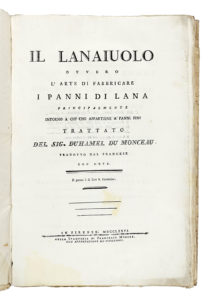 Duhamel du Monceau Henri Louis, Il Lanaiuolo ovvero l'arte di fabbricare i panni di lana [...] tradotto dal francese con note. In Firenze: nella stamperia di Francesco Moucke, 1776.