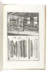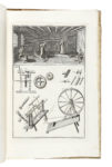 In-folio (mm 430x285). Pagine [4], 122 con 15 tavole calcografiche in fine di volume numerate I-XV. Alcuni finalini xilografici alle carte. Fascicoli un po' slegati, pallide macchie e gore in margine, qualche strappo al margine interno dovuto alla rilegatura un po' cruda, ma complessivamente buona copia nelle sue barbe, con le tavole ben conservate, e nel suo cartonato rustico con titolo manoscritto al dorso (gravi mancanze al dorso). (1) Prima edizione italiana, tradotta da Giacomo Paolo Lelorgne, del significativo trattato nel quale vengono illustrati i metodi di fabbricazione dei panni in lana, partendo dalle modalità di filatura e sino ai diversi trattamenti effettuati sul prodotto finale, come la tecnica della sodatura, ovverosia la pressione dei panni inumiditi con macchinari a caldo per conferire loro maggiore spessore. Di ispirazione per la redazione dell'opera fu sicuramente la Encyclopedie, alla quale il Lanaiuolo deve l'impostazione bipartita dei contenuti: una prima sezione descrittiva delle tecniche ed un apparato finale con illustrazioni dei macchinari tessili e dei procedimenti di fabbricazione.