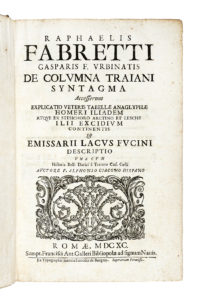 In-folio (mm 320x206). Pagine: [2], 420, [64]; con 2 carte di tavola ripiegate. Marca tipografica al frontespizio, iniziali, testatine e numerose illustrazioni xilografiche. Bruniture e fioriture sparse più marcate in alcune carte, nel complesso una buona copia. Piena pergamena rigida coeva con titoli in oro al dorso entro tassello in marocchino e 5 nervi, il dorso con delle piccole mancanze. (1) Seconda edizione dopo la prima del 1683 dell'opera principale del dotto antiquario urbinate Raffaele Fabretti che, grazie a un rinnovato uso dell'archeografia, riesce a portare nuova luce sul significato degli intagli che adornano la colonna Traiana. Rossetti n° 4798.