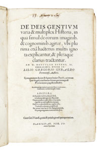 Giraldi Lilio Gregorio, De deis Gentium varia & multiplex Historia... Basileae: Per Ioannem Oporinum. [Al colophon:] Basileae: Ex Officina Ioannis Oporini, 1548.