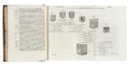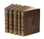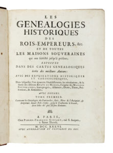 4 volumi in 5 tomi in-4° (mm 255x187). Non collazionato, 2500 pagine circa. Oltre 400 tra tavole genealogiche in gran parte ripiegate e xilografie araldiche, sia fuori che nel testo. Qualche pallida brunitura sparsa, macchioline, leggere fioriture e altri segni del tempo. Piacevole legatura coeva francese in piena pelle con titoli entro tassello in marocchino e fregi in oro al dorso con 5 nervi, sguardie marmorizzate e tagli rossi, qualche leggera abrasione e sbucciatura. (5) Interessante opera che si concentra sulla tracciabilità delle discendenze reali, presentando una mappa dettagliata dei legami familiari tra le diverse casate regnanti del tempo. Per il nome dell'autore Johann Hubner e per il nome del traduttore Louis Chasot de Nantigns, cfr. Barbier, Dictionnaire des ouvrages anonymes, v. 2, col. 533.