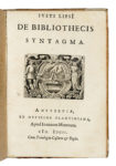 [RILEGATO CON:] De bibliothecis syntagma. Antuerpiae: ex officina Plantiniana, apud Ioannem Moretum, 1602. In-4° (mm 234x159), in 2 parti. Pagine: 218, [6]; 34, [2]. Marca calcografica ad entrambi i frontespizi (con compasso e stesso motto "Labore et Constantia" ma figure diverse). Prima opera illustrata da numerose incisioni su rame di cui molte a piena pagina. Iniziali e fregi xilografici. Poliorceticon con carte uniformemente brunite, lavoro di tarlo che tocca il testo ai fascicoli F-G, strappo alla carta G1 e altri strappetti alle carte Q3-4. Syntagma con qualche carta arrossata. Cerniera posteriore allentata. Mezza pergamena settecentesca con tassello al dorso, tagli rossi (difetti). (1) OPERA I: Seconda edizione dopo la prima del 1596 di questo notevole trattato su macchine e tecniche da guerra (varie dell'antica Roma), ben illustrato da fini incisioni. OPERA II: Prima edizione di questo studio delle biblioteche dell'antichità, di cui furono stampate 1150 copie (cfr. Bibl. Belgica III, L 144: "Notice sur les bibliotheques chez les Anciens. Elle a ete tiree a 1150 exemplaires.").