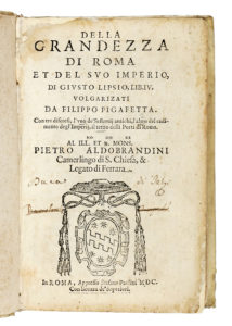 In-8° (mm 156x98). Pagine [16], 367, [1]. Testo in corsivo, greco e romano con iniziali e fregi xilografici, stemma del dedicatario cardinale Pietro Aldobrandini sul frontespizio. Alcune bruniture e fioriture, lieve restauro al margine supereriore delle prime carte e ad alcune carte del fascicolo N e R, interessante nota dattiloscritta applicata al margine interno di Z4r. Piena pergamena antica con dorso posteriore, titolo manoscritti al dorso. (1) Prima traduzione italiana dell'importante opera di Giusto Lipsio (1547-1606) dedicata alla storia e alla grandezza dell'Impero romano. Articolato in quattro libri, il testo analizza in dettaglio le conquiste territoriali, i confini, le guarnigioni e le armate, soffermandosi sul sistema militare, i tributi, le fortificazioni, l'architettura, gli edifici pubblici, le piazze, le terme e altre infrastrutture dell'antica Roma. Seguono tre distinti trattati a firma del traduttore Filippo Pigafetta (1533-1604), architetto militare vicentino e celebre viaggiatore, dedicati rispettivamente ai sesterzi romani, alle cause della decadenza degli imperi e ai porti di Roma. Questa è l'unica edizione della versione italiana dell'Admiranda sive de magnitudine Romana di Lipsio (1598), condotta dal Pigafetta. Non censita in Adams né in BMC STC.