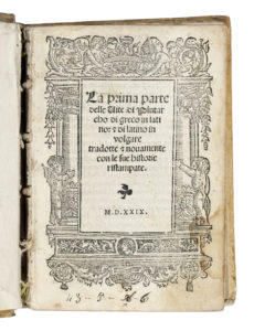 Plutarchus, La prima parte delle vite [...] di greco in latino et di latino in volgare tradotte et nuovamente con le sue historie ristampate. 1529. (Al colophon:) In Vinegia: per Francesco di Alessandro Bindoni et Mapheo Pasini, 1529.