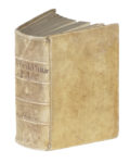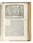In-8° (mm 150x110). Carte 528. Un solo volume dei due previsti dall'opera. Frontespizio inquadrato entro graziosa cornice xilografica, marca in fine; incisioni in legno interne alle pagine. Cerniera anteriore quasi sciolta, primi e ultimi fascicoli con piccoli restauri, con una piccola macchia d'inchiostro al margine, e con qualche pallida gora, un paio di carte sciolte, ma nel complesso copia genuina in piena pergamena rigida antica con titolo manoscritto al dorso. (1) Bella e rara edizione delle Vite di Plutarco, qui presentata nella sola prima parte (la seconda verrà data alle stampe solo nel 1537). Haym 8.