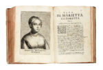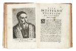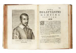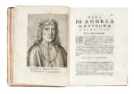2 tomi in 1 volume in-4° (mm 211x154). Pagine [64], 406, [2]; [60], 324. Iniziali, testatine e finalini xilografici, ritratti calcografici. Margine bianco inferiore dell'antiporta e del secondo frontespizio asportato e reintegrato da carta bianca, primo fascicolo parzialmente staccato dalla legatura, macchiette, gorette (più evidenti agli ultimi fascicoli del secondo tomo) e fioriture sbiadite, alcune carte ingiallite, P3 con strappo e piccola mancanza di testo, frontespizio, 2L2 e 2L3 con cancellature marginali in bianco, e altri trascurabili tracce del tempo. Mezza pergamena posteriore con piatti in cartonato, titoli dorati in tassello al dorso, tagli spruzzati di rosso. (1) Esemplare con belle impressioni delle tavole che ritraggono, accompagnati da descrizioni, i principali artisti veneziani dei secoli XV, XVI e XVII, tra cui Andrea Mantegna, Carpaccio, Giovanni Bellini, Giorgione, Paris Bordone, Palma il Giovane e Palma il Vecchio, Lorenzo Lotto, Moretto, Tiziano, Veronese, Tintoretto, oltre ai figli di quest'ultimo.