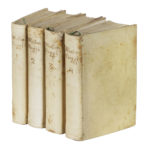 4 volumi in-8° (mm 154x92). 1° tomo pagine XXI, [1], 472, [2] e [9] carte di tavole; 2° tomo pagine 619, [1] e [8] carte di tavole; 3° tomo pagine 648 e [9] carte di tavole di cui una più volte ripiegata; 4° tomo pagine 646, [2] e [8] carte di tavole. 1 ritratto di Seriman all'antiporta del primo tomo (identificato dalla didascalia come "Enricus Wanton anglus") e 32 tavole incise in rame fuori testo raffiguranti scimmie in vesti umane, inclusa la mappa più volte ripiegata raffigurante la "Provincia de' Filosofi". Occasionali fioriture e macchioline sbiadite e altri trascurabili segni del tempo. Piena pergamena coeva con titoli manoscritti al dorso (minimi difetti). (4) Importante romanzo utopico-filosofico, prodotto dal vivace e bizzarro ingegno di Zaccaria Seriman, celato sotto le mentite spoglie dell'inglese Enrico Wanton. In questo viaggio immaginario nelle terre sconosciute dell'Oriente e dell'Emisfero australe, che si ricollega al Gulliver swiftiano, Seriman affronta le principali problematiche del suo secolo immaginando differenti modelli culturali e societari, da cui scaturisce anche una pungente satira soprattutto della società veneziana del tempo; cfr. Romanzieri e romanzi del Settecento 229: «la più vasta e completa satira che uno scrittore italiano ci abbia data in forma di romanzo, di tutti gli aspetti della civile società in mezzo alla quale ha vissuto». Il romanzo fu stampato una prima volta in 2 volumi nel 1749, poi notevolmente ampliato e corredato di figure venne pubblicato a cura dell'Autore stesso nella stamperia privata a Villa di Melma presso Treviso, dai Remondini; cfr. Melzi III, 216 e Parenti 37.