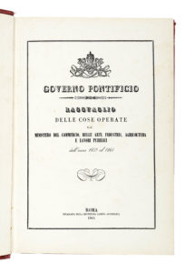 Stato Pontificio (Governo), Ragguaglio delle cose operate dal Ministero del Commercio, delle Belle Arti [...] dall'anno 1859 al 1864. Roma: Tipografia della Reverenda Camera Apostolica, 1864.