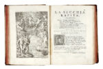 In-4° (mm 251x185). Pagine LX, 92, 489, [3]. Antiporta, frontespizio in rosso e nero con graziosa vignetta calcografica, ritratto del Tassoni, XII tavole (ciascuna in apertura di ogni canto), [5] tavole ripiegate (una tipografica con la genealogia dei Tassoni di Modena, le altre calcografiche con il "Carroccio de' Modenesi", il facsimile della grafia del Tassoni, la "Tavola Geografica del Padovano e Romagna", e la grande "Tavola geografica del Modanese" ripiegata in fine). Al recto dell'ultima carta, illustrazione xilografica con la Ghirlandina: Torre di marmo bianco alta braccia di Modena CLXIV once VIII. Ex libris al contropiatto anteriore. Aloni sbiaditi ad alcuni margini esterni, qualche piccolo restauro a strappetti o agli attacchi delle carte. Occasionali pallide fioriture e altri trascurabili segni del tempo. Mezza pelle con punte, piatti marmorizzati e titoli dorati in tassello rosso al dorso, con fregi oro (abrasioni). (1) «Stimatissima edizione» figurata (Gamba 2097) di uno dei principali poemi eroicomici della nostra letteratura, con le tavole incise in rame da Francesco Zucchi, Andrea Bolzoni, Bartolomeo Bonvicini, Cantarelli, Benedetti e Zuliani su disegni di Domenico Fratta, Francesco Villani ed altri. Cfr. Brunet V, 675; Graesse VI, 40; Piantanida 3018 «Edizione assai pregiata per contenuto e veste tipografica, da tutti definita come la migliore edizione della "Secchia"; è l'"editio maior"»; Razzolini-Bacchi della Lega 345.