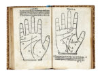 In-8° (mm 147x95). Carte [91 di 96]. Iniziali xilografiche, varie immagini xilografiche nel testo e xilografia raffigurante il Cristo al frontespizio. Due piccoli forellini nel testo al frontespizio, carte pallidamente ingiallite con occasionali macchioline sbiadite. Alcune carte presentano un minimo restauro all'attacco della legatura, margine esterno e superiore leggermente corti. Assenti 3 carte del fascicolo A e 2 al fascicolo D (una delle quali bianca). Pieno marocchino marrone moderno con decorazioni oro ai piatti e titoli e fregi al dorso, Sguardie marmorizzate, tagli dorati. (1) Rarissima prima edizione in italiano di questo trattato chiromantico, pubblicato in latino nel 1522.