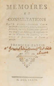 Pierre-Augustin Caron de BEAUMARCHAIS. Mémoires et consultations… S.l.n.n., 1774. - Supplément au mémoire et consultation… Seconde partie. Ibid., id. 1774. - Quatrième mémoire à consulter… contre M. Goezman… S.l.n.d. 2 ouvrages en un...