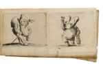 extraites de trois suites dont aucune n'est complète mais dont les titres sont présents : Varie figure Gobbi. Florence, 1616. - Varie figure. S.l.n.d. (vers 1623). - Capricci di varie figure. S.l.n.d. La première suite semble presque complète de 19 pièces sur 21. La seconde suite comprend 13 planches sur 17 et la troisième 16 pièces sur 50 sans que nous puissions certifier qu'elles sont bien extraites de ces deux dernières suites. Vélin fortement sali avec manque au dos, quelques taches.