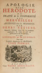 Henri ESTIENNE. Apologie pour Hérodote ou Traité de la conformité des merveilles anciennes avec les modernes... La Haye, Henri Scheurleer, 1735. 2 parties en 3 volumes in-12, maroquin bleu, triple filet, dos lisses ornés, roulette intérieure,...