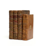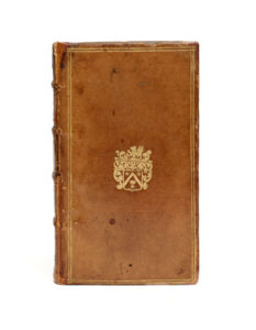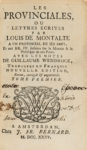 In-16, veau blond, double filet doré, armoiries au centre des plats, dos à 4 nerfs orné d'une fleur de lys répétée (Reliure de l'époque). Brunet, IV-395 / Maire, II-171 / Olivier, 335 / Tchemerzine-Scheler, IV-69 /// (12f.)-396-108. Réimpression, à la même date, de l'édition elzévirienne de 1657, qu'on reconnaît par la mention religieux mandians au lieu de moines mendians, ainsi que par une légère différence de collation. Cette seconde édition in-12 présente un certain nombre de variantes et de corrections et comporte le texte définitif tel qu'il sera adopté dans toutes les éditions postérieures. Exemplaire aux armes de François Dugué, bibliophile lyonnais qui fut notamment intendant de justice, police et finances au XVIIe siècle. Son fils, également prénommé François, utilisa les mêmes fers ; il fut président de la Chambre des comptes de Paris et mourut en 1688. La reliure a été l'objet de nombreuses restaurations et nous pensons que les armes ont été ajoutées postérieurement. Coiffes, mors et coins restaurés, mors frottés, galerie de vers dans la marge inférieure des 25 premiers feuillets. On joint : PASCAL. Les Provinciales… Amsterdam, J. Fr. Bernard, 1735. 3 volumes in-12, veau brun, dos à 5 nerfs (Reliure de l'époque). Maire, II-1ère partie, 244 /// I. (8f.)-404 / II. (6f.)-376 / III. (6f. dont un blanc)-372. Nouvelle édition ornée de 3 frontispices gravés. Manques aux coiffes et aux coins ; titres tachés.