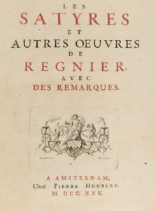 Mathurin RÉGNIER. Les Satyres et autres oeuvres de Régnier avec des remarques. Amsterdam, Pierre Humbert, 1730. In-4, veau flammé, fine guirlande en encadrement sur les plats, dos lisse très joliment orné (Reliure de l'époque)....