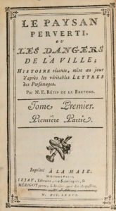 Nicolas Edme RESTIF de LA BRETONNE. Le Paysan perverti, ou Les Dangers de la ville ; Histoire récente, mise au jour d'après les véritables lettres des Personnages. La Haye et Paris, Lejay, Mérigot, 1776. 8 parties en 2 volumes in-12, basane...