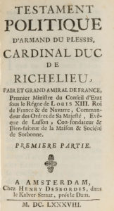 [Jean-Armand Du Plessis, cardinal duc de RICHELIEU]. Testament politique... Amsterdam, Henry Desbordes, 1688. 2 tomes en un volume in-16, maroquin rouge, triple filet, dos lisse joliment orné, roulette intérieure, tranches dorées (Reliure du...