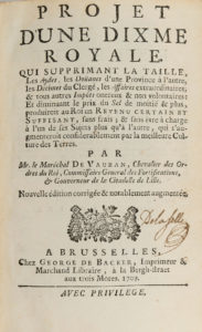 Sébastien Le Prestre de VAUBAN. Projet d'une dixme royale... Brusselles, George De Backer, 1709. In-12, veau tabac, dos à 5 nerfs orné (Reliure de l'époque). Cioranescu, III-65589 /// (5f.)-203 (marquées 199)-(16f.). Nouvelle édition parue deux...