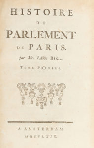 [VOLTAIRE]. Histoire du Parlement de Paris Par Mr l'Abbé Big…. Amsterdam, s.n. (Marc-Michel Rey), 1769. 2 volumes in-8, maroquin rouge, triple filet doré, dos lisses ornés, tranches dorées (Reliure de l'époque). Bengesco, I-1247 / Lh., 611 /...