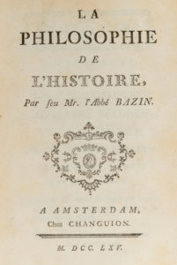 [VOLTAIRE]. La Philosophie de l'histoire. Par feu Mr. l'Abbé Bazin. Amsterdam, Changuion, 1765. In-8, veau marbré, dos lisse orné (Reliure de l'époque). Bengesco, I, p. 333, n° VIII, 1164 et s. / Le Petit, 554 /// VIII-304. Édition originale...