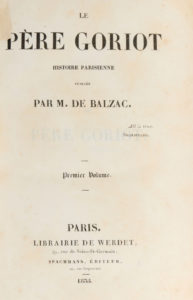/ II. (2f.)-374-(1f.). Édition originale. Le Père Goriot avait paru dans La Revue de Paris en 4 livraisons entre le 14 décembre 1834 et le 11 février 1835. Exemplaire de premier tirage sans la préface de 16 pages qui ne fut fournie que quelques jours après la parution des volumes. Dos passés et anciennement reteintés. Mouillure en pied du second volume, quelques taches et rousseurs, un feuillet remonté (t.I, p. 351) et manque angulaire à 2 feuillets sans atteinte au texte (t.I, p. 169 et t.II, p. 191).