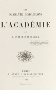 Jules BARBEY D'AUREVILLY. Les Quarante médaillons de l'académie. Paris, Dentu, 1864. In-12, demi-maroquin rouge, dos à 5 nerfs, tête dorée, couverture (Reliure de l'époque). Vicaire, I-303, 304 /// (2f.)-135. Édition originale de ces jugements...