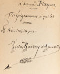 sans appel des quarante académiciens. Envoi autographe signé sur un feuillet de garde à Armand Hayem / Des épigrammes à qui les / aime / et n'en inspire pas / Jules Barbey d'Aurevilly (avec flèche). Armand Lazare Hayem (1825-1889) fut homme de lettres et homme politique. Il est le frère de Charles Hayem, collectionneur et mécène avec lequel Barbey fut lié. Petits frottements à la reliure et tache blanchâtre.
