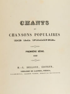 CHANTS ET CHANSONS POPULAIRES DE LA FRANCE. Paris, Delloye, 1843. 3 volumes in-4, bradel demi-maroquin bleu nuit à long grain à coins, dos lisse joliment ornés, couvertures (Carayon). Vicaire, II-234 /// I. (5f.)-28 livraisons de (4f.) / II....