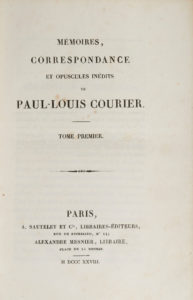 Paul-Louis COURIER. Mémoires, correspondances et opuscules inédits. Paris, Sautelet et Mesnier, 1828. 2 volumes in-8, demi-veau glacé rouge, dos à 4 nerfs ornés de fers à froid et dorés (Reliure de l'époque). Carteret, I-189 / Lh., 183 /...