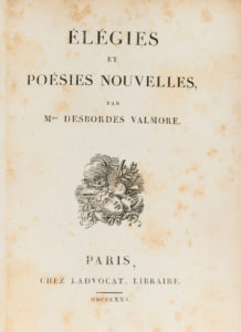 Marceline DESBORDES-VALMORE. Élégies et poésies nouvelles. Paris, Ladvocat, 1825. In-16, demi-maroquin rouge à long grain, double filet doré sur les plats, dos lisse joliment orné de fleurons spéciaux (Reliure de l'époque). Vicaire, III-197...