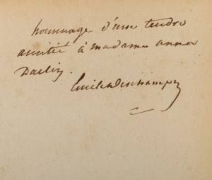 1823-1824, sous la signature de Le Jeune Moraliste. L'édition a échappée à Vicaire. Elle est composée d'un faux-titre et titre et de la réunion des neuf articles dont on a réimprimé les premiers et derniers feuillets Émile Deschamps est une figure incontournable du mouvement romantique qui a laissé des recueils de poésies, des oeuvres en prose et des pièces de théâtre. Il a collaboré au Conservateur littéraire et à la Muse Française. Envoi autographe signé sur un feuillet de garde, Hommage d'une tendre / amitié à Madame anna Darlin ( ?) / Émile Deschamps. Exemplaire cité par Maurice Escoffier dans Le Mouvement romantique (n° 611).