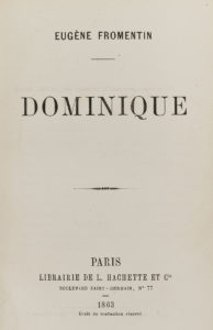 Eugène FROMENTIN. Dominique. Paris, L. Hachette, 1863. In-12, demi-veau blond, dos lisse orné (Reliure de l'époque). Vicaire, III-840 /// (3f.)-372. Édition originale au format in-12. Dos frotté ; manque de 1mm dans la marge d'un feuillet.