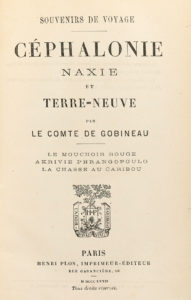 Arthur de GOBINEAU. Souvenirs de voyage. Céphalonie, Naxie et Terre-Neuve. Paris, Henri Plon, 1872. In-12, demi-basane bleue, dos lisse (Reliure de l'époque). Lh., 280 /// (2f.)-222-(1f.). Édition originale de ce recueil contenant Le Mouchoir...
